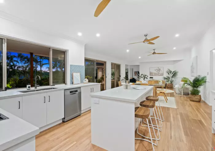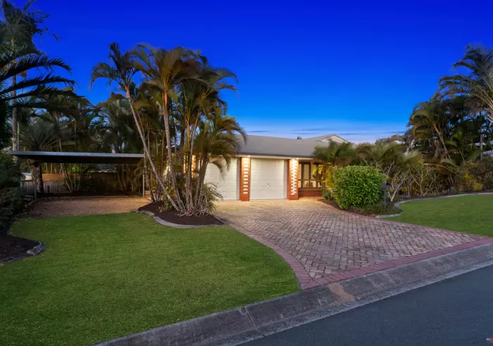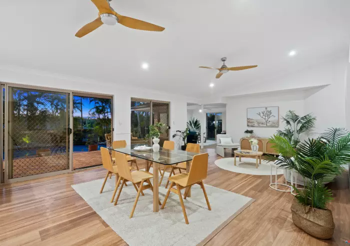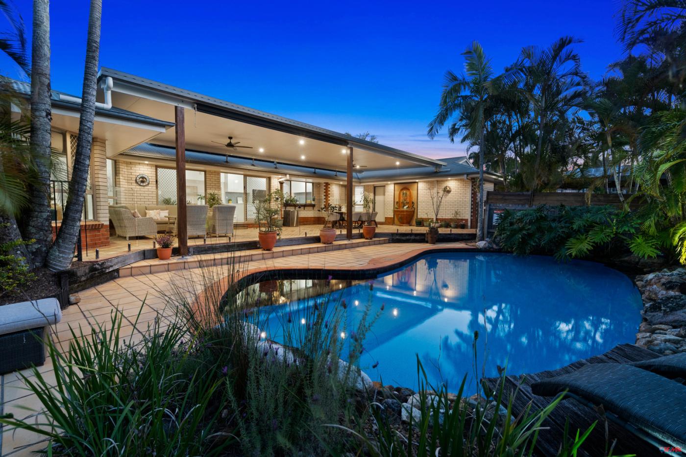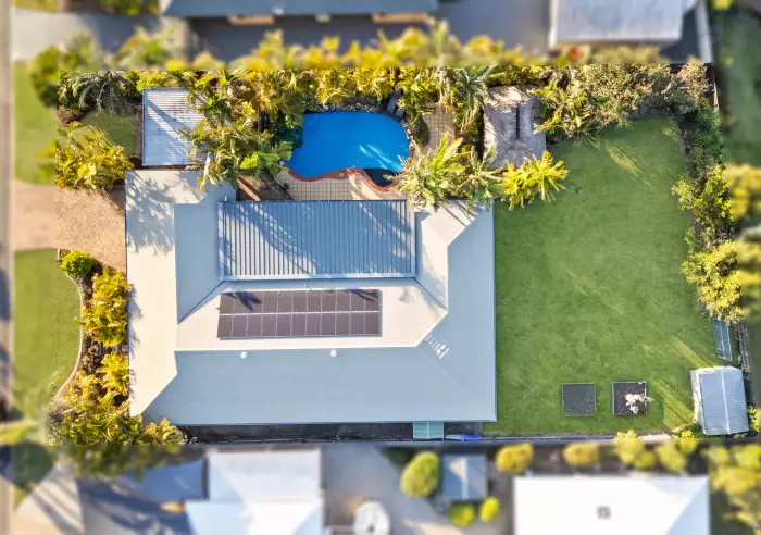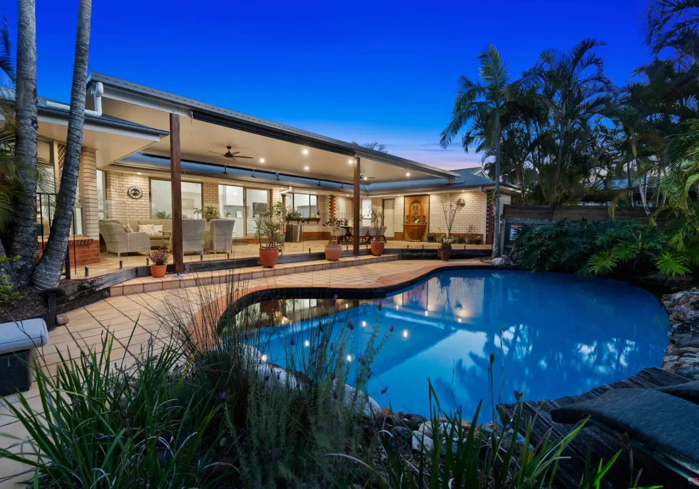 Outdoors, a tropical haven awaits. The covered patio overlooks lush gardens and a sparkling pool, providing the perfect setting for both lively gatherings and quiet moments of calm. Just when you thought it couldn't get any better, a wide stretch of lawn appears - the kind every family dream of, with room for Christmas Day cricket, a kick of the footy, or the playground the kids have always wanted.