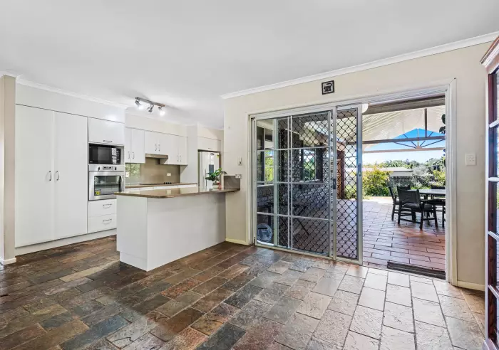 From the kitchen and family area, sliding doors open to a huge outdoor entertaining space with a pitched roof. Overlooking the backyard, it's an inviting setting for relaxing and entertaining with family and friends.