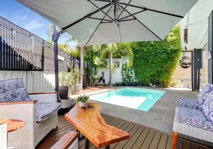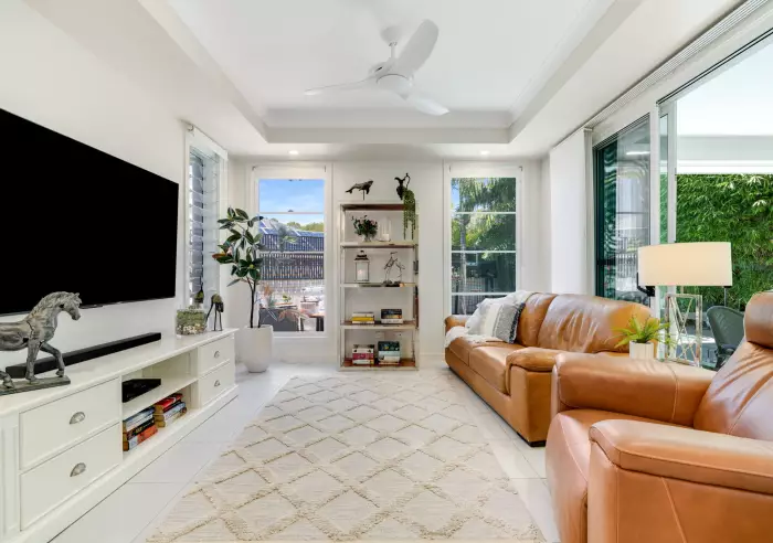 Outdoors, the entertaining area is a true highlight. The covered alfresco overlooks the therapeutic mineral pool, with timber decking and lush, easy-care tropical landscaping creating a resort-style setting. Whether hosting friends or unwinding in peace, this tranquil space is perfect year-round.