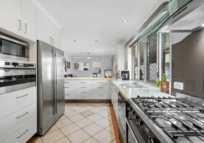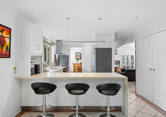Downstairs offers multiple living areas featuring air-conditioned living and dining areas, ideal for both everyday comfort and entertaining. The central kitchen overlooks the outdoor entertaining area and backyard, and includes a convenient servery window for all your entertaining needs. Showcasing stone bench tops, soft-close cabinetry, a SMEG 900mm stainless steel gas cooktop with electric oven, separate steam oven, dishwasher, pantry, double sink and ample storage, it will impress the home chef.